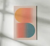 Questa moderna opera d'arte combina forme chiare con morbide sfumature di colore nei colori albicocca, rosato e blu petrolio. La composizione minimalista con due superfici semicircolari crea calma, equilibrio ed estetica elegante. Perfetta per gli interni moderni e scandinavi e per tutti coloro che amano l'arte murale calma con un accento di colore.