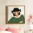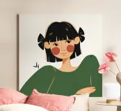 Un ritratto semplice e grafico di una ragazza con capelli corti e neri e guance rosee, che indossa un top verde, con un'espressione diretta e leggermente imbronciata su uno sfondo bianco.