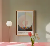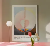 Questo accattivante poster della mostra presenta una profonda opera d'arte astratta di Hilma af Klint, "L'albero della conoscenza, n. 5", caratterizzata da spirali eteree, cerchi concentrici e dal delicato spettro dell'arcobaleno. Le morbide tonalità pastello del rosa, del giallo, del blu e del marrone si fondono senza soluzione di continuità, creando un senso di profondità spirituale e armonia cosmica. Il poster pubblicizza la mostra "Hilma af Klint - Artista, ricercatrice, medium" al Museo d'Arte Moderna di Stoccolma, dal 16 febbraio 1977 al 26 maggio 1977. Questo poster digitale di alta qualità (7000x5000 pixel, 300 dpi) cattura magnificamente l'atmosfera mistica della mostra.