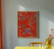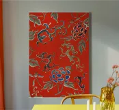 Questa audace opera d'arte di ispirazione tessile giapponese presenta un intricato disegno di figure mitiche simili a draghi e motivi floreali stilizzati su un suggestivo sfondo rosso. I vivaci fiori blu e viola contrastano splendidamente con i vorticosi motivi decorativi, evocando i kimono e l'arte tessile tradizionale. Perfetta fusione di forza ed eleganza, questo pezzo aggiunge un tocco drammatico e sofisticato a qualsiasi interno. Fornito in qualità digitale premium (7000x5000 px, 300 dpi), ideale per opere d'arte da parete, decorazioni ispirate alla moda o poster d'effetto.