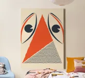 Un accattivante poster astratto con una forte influenza surrealista e modernista, che ricorda le opere figurative di Paul Klee. L'immagine è incentrata su una composizione che suggerisce un volto stilizzato, dominato da un grande triangolo arancione strutturato che funge da naso. Ai lati della parte superiore si trovano due grandi occhi a mandorla di colore blu scuro e arancione, con pupille semplici e scure. La base del triangolo del naso si interseca con un triangolo separato riempito di sottili linee orizzontali nere ondulate, che aggiungono consistenza visiva. Questo download digitale di alta qualità (7000x5000 pixel, 300 dpi) garantisce un'arte nitida e intrigante.