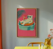 Un'illustrazione stravagante e vivace di un orso polare che vive la sua vita migliore: occhiali da sole, cocktail nella zampa e galleggiante in una piscina per bambini con una mini cascata. Su uno sfondo tropicale rosa caldo, quest'opera d'arte dona un tocco di umorismo e vibrazioni rilassanti a qualsiasi spazio. Perfetto per gli amanti dell'arte eccentrica, dell'estetica retrò e dell'atteggiamento rilassato. Che sia per il salotto, l'ufficio o la casa estiva, questo pezzo garantisce sorrisi.