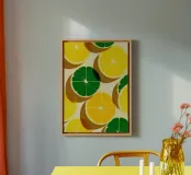 Un'opera d'arte digitale audace e giocosa con fette di limone e lime stilizzate disposte in un vivace motivo geometrico. Con ombre nitide e una texture tattile della carta, questo disegno fonde l'estetica Bauhaus con la freschezza mediterranea. Perfetto per l'arredamento della cucina, per le stampe estive o per gli amanti dell'arte moderna da parete.