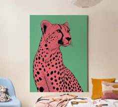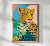 Dieses ausdrucksstarke Porträt zeigt einen Leoparden in leuchtenden Pop-Art-Farben mit intensiven Gelb-, Grün- und Blautönen. Die feinen, malerischen Strukturen und der selbstbewusste Blick verleihen dem Tier eine kraftvolle, fast majestätische Präsenz. Das Motiv verbindet Wildnis mit moderner Illustration und strahlt Energie, Stärke und zeitgenössische Ästhetik aus.
