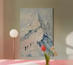 Una dinamica veduta aerea di una stazione sciistica invernale, dove gli sciatori si muovono tra i pendii innevati delle montagne. La scena energica contrasta con l'ambiente tranquillo circostante, evidenziando la vastità della località e il senso di avventura. Pennellate decise creano consistenza e movimento, immergendo lo spettatore nell'emozione degli sport invernali.