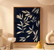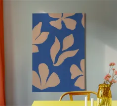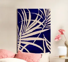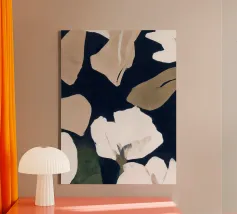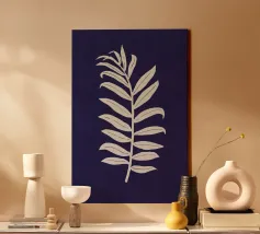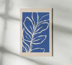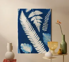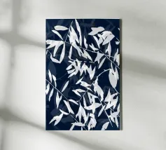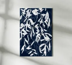 A striking cyanotype-style composition capturing delicate white leaves drifting across a deep indigo field. This piece evokes early botanical photography with a contemporary edge—organic yet graphic, timeless yet modern. Perfect for interiors that lean toward minimalist naturalism or vintage scientific aesthetics.