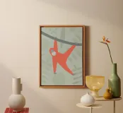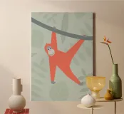 Illustrazione carina e minimalista di un orango tra grandi foglie nella giungla. Colori tenui, moderni.