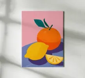 Una natura morta semplice e ben composta di un'arancia intera e di un limone, uno dei quali tagliato, su uno sfondo rosa tenue. L'opera è uno studio minimalista, fresco ed elegante sugli agrumi.