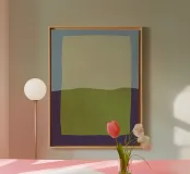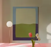 Domina uno stile minimalista con ampie fasce di colore blu, verde e viola, separate da linee rette per creare una composizione segmentata. L'elemento centrale ricorda un paesaggio stilizzato con un primo piano, un orizzonte e un cielo semplificati.