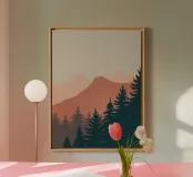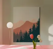 I toni tenui del rosa e del grigio formano un sereno paesaggio montano con pini in primo piano. La semplicitร  e la sfumatura dei colori creano un'atmosfera pacifica e rasserenante.