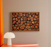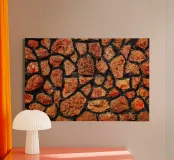 Una parete rustica composta da pietre rosse irregolari con sfumature e texture diverse. A uno sguardo più attento, la disposizione suggerisce un sottile motivo a spirale, dando alla composizione un intrigante tocco astratto. Perfetto come opera d'arte da parete per caffè, ristoranti, uffici o interni moderni che abbracciano le texture naturali.