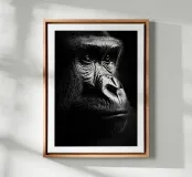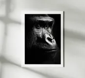 Un ritratto potente e commovente di un gorilla in bianco e nero, che mette in evidenza gli affascinanti dettagli del suo volto e il suo sguardo profondo. Una decorazione da parete perfetta per aggiungere un'atmosfera maestosa e naturale alla vostra casa.