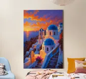Questo dipinto a olio ritrae magnificamente l'affascinante tramonto di Santorini, dove le iconiche cupole blu incontrano il cielo arancione. Il tenue bagliore della luce serale esalta i nitidi edifici imbiancati a calce che scendono lungo la scogliera. Il tranquillo Mar Egeo riflette le calde tonalità del cielo, mentre le vibranti bouganville danno un tocco di fascino in più. L'ambiente idilliaco incarna il romanticismo pacifico e la bellezza senza tempo di questa isola paradisiaca greca, perfetta per i sognatori e i viaggiatori.