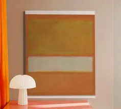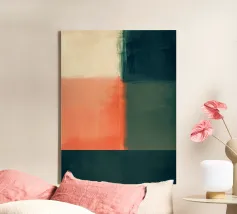 Ispirato allo stile di Mark Rothko, questo dipinto astratto mostra campi di colore delicatamente fusi in viola, verde scuro e beige, che creano un'atmosfera meditativa ed emotiva. Al centro si trova un campo luminoso che conferisce calma e profondità alla composizione. La disposizione minimalista e moderna dei blocchi di colore invita lo spettatore a contemplare l'effetto puro del colore e della forma.