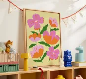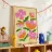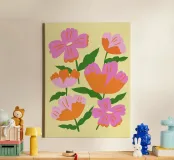 Fiori dai colori vivaci nei toni del rosa e dell'arancio con foglie verdi sono disposti su uno sfondo giallo tenue. Il disegno floreale è caratterizzato da forme audaci e semplicistiche che creano una composizione giocosa e vivace.