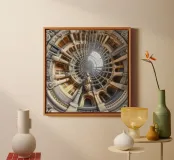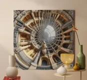 Questa immagine mostra un'intricata architettura circolare con colonne di pietra ornate, una statua centrale e un soffitto di vetro. La prospettiva surreale crea un effetto tunnel, attirando lo sguardo verso il centro della composizione.