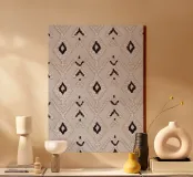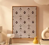 Dieser elegante, orientalische Weberei Illustration vereint moderne und vintage Elemente mit symmetrischen Rautenmuster in sanften Pastell- und Cremefarben, perfekt für einen Boho-Stil.