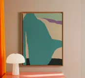 Un mix di forme e colori forma un disegno astratto con una forma dominante di colore blu acqua al centro. La composizione presenta aree di colore piatte e decise e i bordi tra le forme sono netti e ben definiti.
