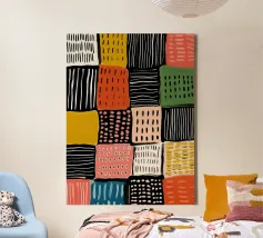 Una vibrante composizione astratta che ricorda una trapunta patchwork, con vari blocchi di colore, motivi geometrici e texture che creano un disegno vivace e tattile.