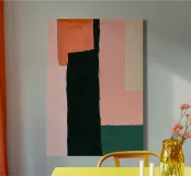 Un dipinto minimalista con una tavolozza di colori rosa e verdi, pennellate spesse e forme astratte. Un grande rettangolo nero verticale si trova al centro della composizione, illustrando i principi del minimalismo e l'uso dello spazio negativo. Il dipinto contiene anche tonalità arancioni chiare e rosse scure, che creano un'opera visivamente sorprendente ed equilibrata.