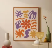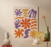 Una composizione astratta giocosa e gioiosa di varie forme organiche e fluide ispirate a Matisse, in un'allegra tavolozza di arancione, viola, beige e blu.