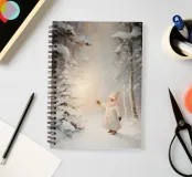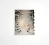 Tranquilla scena invernale con un bambino in cappotto bianco e sciarpa rosa che si protende verso un piccolo albero innevato illuminato, circondato da alti alberi innevati.