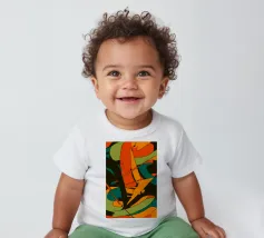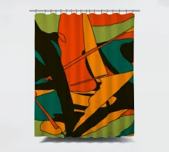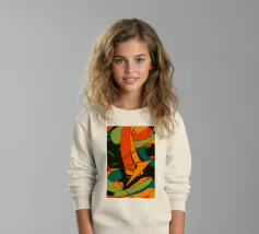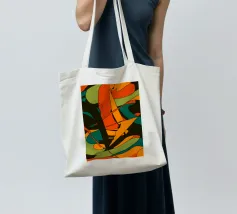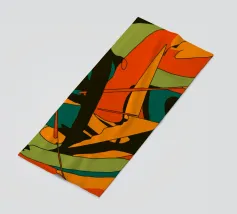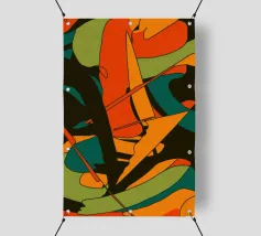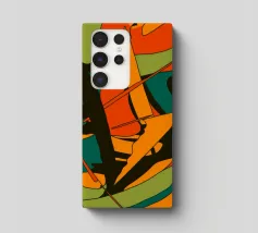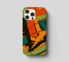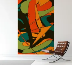 Un motivo astratto dinamico e lunatico di forme di foglie sovrapposte in una calda tavolozza autunnale di arancione, verde e nero. L'opera è energica e piena di movimento organico.