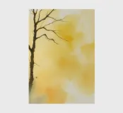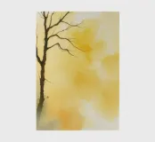 Un albero alto e spoglio si erge solitario su uno sfondo giallo tenue, con un artistico effetto acquerello. I rami si estendono verso l'alto, creando una silhouette suggestiva.