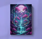 Cascata incantata al chiaro di luna. Un paesaggio surreale caratterizzato da cascate sotto una grande luna luminosa. Alberi di ciliegio in fiore con fogliame rosa vibrante arricchiscono la scena.