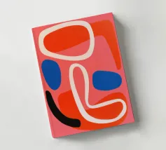 Forme astratte sono disposte su uno sfondo chiaro, creando una composizione che suggerisce un profilo facciale frammentato. Colori vivaci come il blu, l'arancione e il nero sono utilizzati per gli elementi geometrici, in contrasto con il sottile sfondo.