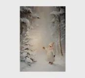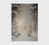 Tranquilla scena invernale con un bambino in cappotto bianco e sciarpa rosa che si protende verso un piccolo albero innevato illuminato, circondato da alti alberi innevati.