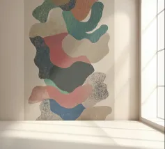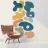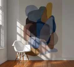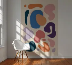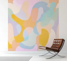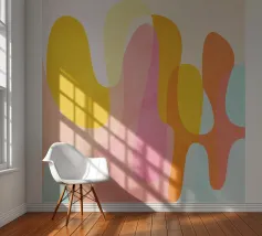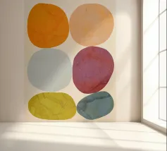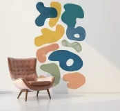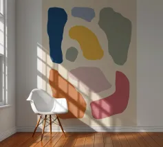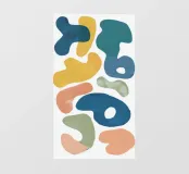 Una collezione di forme lisce, astratte, simili a ciottoli, in una piacevole tavolozza di bianco, giallo, verde acqua e blu, che crea un motivo giocoso e moderno, organico e grafico al tempo stesso.
