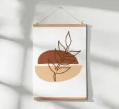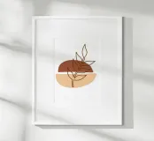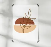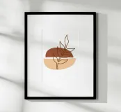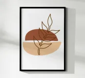 Una composizione astratta presenta un semplice sfondo geometrico marrone e beige con un delicato disegno al tratto di un ramoscello frondoso. Il design minimalista enfatizza gli elementi naturali in un equilibrio armonioso.