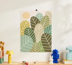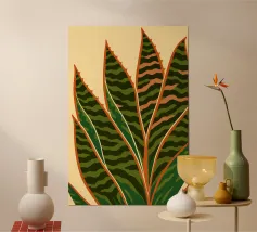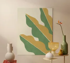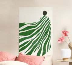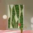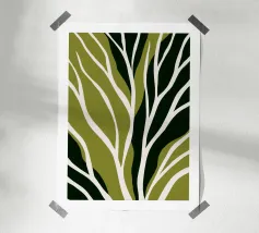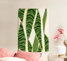 I motivi geometrici astratti a strisce verdi e gialle creano un senso di movimento nella composizione. Il disegno presenta elementi verticali di forma irregolare che suggeriscono un tema naturale.