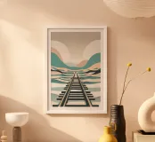 Questa interpretazione artistica astratta della ferrovia di Sylt presenta una fusione fantasiosa di natura e infrastruttura. I binari del treno tagliano dune ondulate e curve ampie di sabbia e mare, creando un contrasto ipnotico tra la rigida geometria della ferrovia e il movimento fluido del paesaggio. I blu pastello, i beige caldi e i grigi tenui conferiscono un'estetica rilassante, rafforzando l'atmosfera pacifica della costa del Mare del Nord. L'opera trasmette il viaggio sempre presente tra terra e mare, tra il mondo strutturato dei trasporti e la bellezza organica della natura di Sylt.
