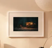 Accogliente notte d'inverno in un camper nei boschi innevati, con un caldo carta hahnemühle