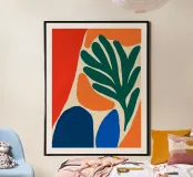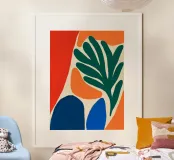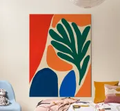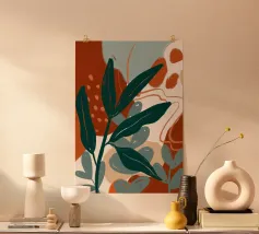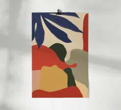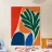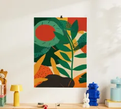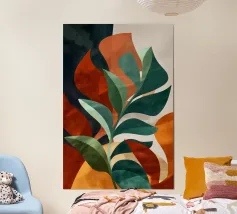 Un'audace composizione astratta presenta forme organiche in vibranti tonalità di arancio, blu e verde. Una grande forma verde simile a una foglia contrasta con il caldo sfondo arancione e rosso.
