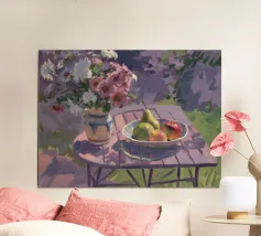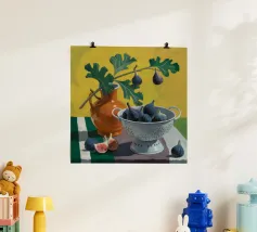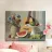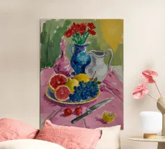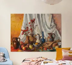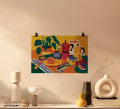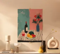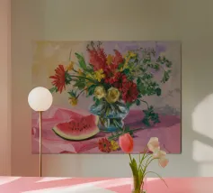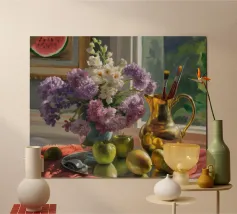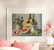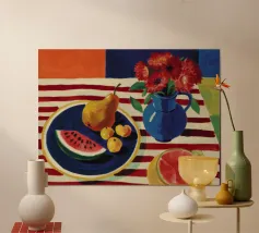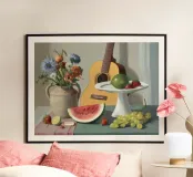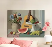 Una natura morta rustica e calda con una chitarra, una brocca, un'anguria e dell'uva. La composizione evoca un senso di vita di campagna piacevole e creativa, con toni caldi e terrosi e una disposizione rilassata e armoniosa.