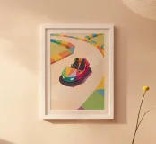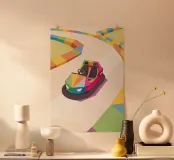 Illustrazione di un autoscontro colorato in un'arena di gioco con uno stile geometrico moderno.