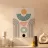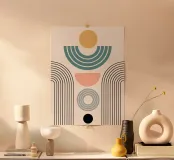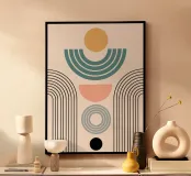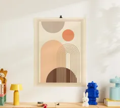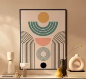 Le forme geometriche sono disposte in una composizione equilibrata con cerchi, archi e semicerchi in tonalità tenui. Il design è caratterizzato da un gioco di linee e forme che creano un senso di simmetria e armonia.