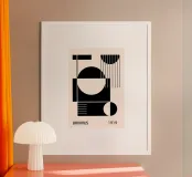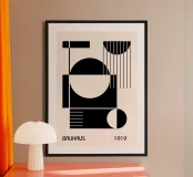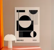 Un classico poster digitale che celebra la fondazione del Bauhaus nel 1919. La composizione asimmetrica presenta un gioco di grandi forme geometriche - quadrati, cerchi e semicerchi - in nero e bianco sporco ad alto contrasto. Le spesse linee nere impongono una struttura chiara, mentre le sottili linee verticali e orizzontali aggiungono profondità e consistenza alle sezioni del disegno. Lo spazio negativo è utilizzato in modo dinamico per completare le forme, incarnando l'estetica funzionalista del Modernismo minimalista. Questo download digitale di alta qualità vanta 7000x5000 pixel a 300 dpi, garantendo una chiarezza eccezionale e una qualità di stampa superiore.