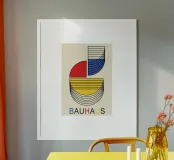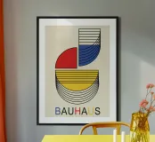 Un classico manifesto astratto Bauhaus che presenta una composizione di forme geometriche fondamentali in colori primari: rosso, blu e giallo. Il disegno è suddiviso in tre parti principali: un quarto di cerchio rosso pieno, un quarto di cerchio blu sezionato da linee nere radianti e un grande semicerchio giallo anch'esso sovrapposto a linee nere, che suggeriscono profondità e dimensione. Su uno sfondo beige chiaro, questo pezzo incarna i principi della grafica modernista. Questo file di poster digitale (7000x5000 pixel, 300 dpi) garantisce linee nitide e colori vividi per una stampa di qualità e degna di un museo.