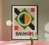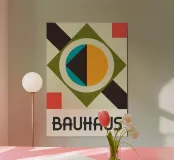 Un manifesto vivace e classico in stile Bauhaus che utilizza forme geometriche audaci e una tavolozza di colori dinamici. Il motivo centrale presenta un cerchio diviso in segmenti giallo senape, verde acqua e marrone scuro, sovrapposti a un grande diamante verde oliva. Questa struttura centrale è collocata su uno sfondo chiaro con linee diagonali scure a contrasto e piccoli quadrati rossi agli angoli, creando una composizione potente ed equilibrata. La parola "BAUHAUS" è ben visibile in basso. Questo poster digitale di alta qualità (7000x5000 pixel, 300 dpi) offre una saturazione dei colori e dettagli superiori per un'icona della metà del secolo scorso.