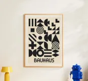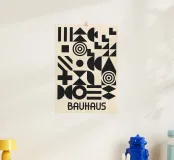 Un poster astratto in bianco e nero, ricco di immagini, caratterizzato da una composizione densa, apparentemente casuale ma strutturata di elementi geometrici che si intersecano. Il disegno è pieno di forme diverse, tra cui quadrati pieni, triangoli, semicerchi, anelli, strisce e cerchi concentrici. Questa complessità celebra le forme fondamentali e i principi di design modulare della scuola Bauhaus e del modernismo astratto. La parola "BAUHAUS" è centrata in grassetto in basso, in un carattere sans-serif pesante e arrotondato. Questo download digitale ad alta risoluzione (7000x5000 pixel, 300 dpi) garantisce una riproduzione nitida e di qualità museale.