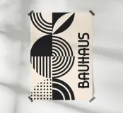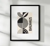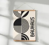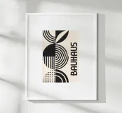 Un sofisticato poster astratto in bianco e nero che incarna i principi fondamentali del design geometrico Bauhaus. La composizione presenta una disposizione verticale di quadranti modulari, ciascuno contenente diversi motivi geometrici: cerchi concentrici, strisce verticali, motivi a punti e una forma organica stilizzata di foglia. Il gioco di nero pieno, strisce e punti crea una texture visiva dinamica. La parola "BAUHAUS" scorre verticalmente lungo il lato destro in un carattere sans-serif pulito e arrotondato. Questa opera d'arte è una pura celebrazione di forma e funzione. Questo download digitale ad alta risoluzione (7000x5000