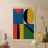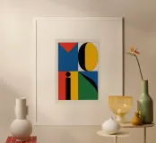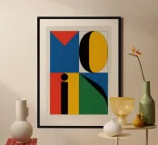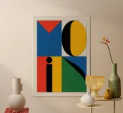 Design di ispirazione Bauhaus con la scritta "MOIN" su sfondo beige chiaro. Quattro quadranti colorati in rosso, blu, giallo e verde costituiscono la base, mentre un cerchio nero nel quadrato giallo e una linea nera verticale collegano i quadranti superiori. Moderno, geometrico e accattivante.