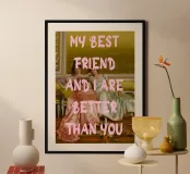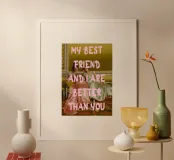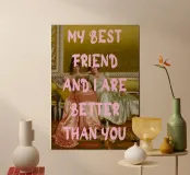 Celebrate il vostro legame indissolubile con "My Best Friend and I Are Better Than You", una spiritosa stampa pop art che unisce l'eleganza classica a una moderna e giocosa dichiarazione di amicizia. Questa accattivante opera d'arte raffigura due serene figure storiche, elegantemente posate su un lussuoso divano, apparentemente impegnate in un libro. Il testo in grassetto, di colore rosa caldo, "IL MIO MIGLIOR AMICO ED IO SONO MEGLIO DI TE" si sovrappone all'immagine, trasformando la scena senza tempo in un'ironica e sicura dichiarazione di esclusività. Perfetto per aggiungere personalità e un tocco di fascino spensierato a qualsiasi spazio contemporaneo. Realizzato ad un