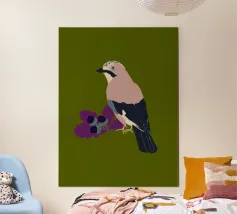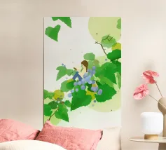 Un uccello è appollaiato su un ramo con grappoli d'uva viola circondati da foglie verdi. I colori vivaci dell'uva e delle foglie creano un contrasto sorprendente.