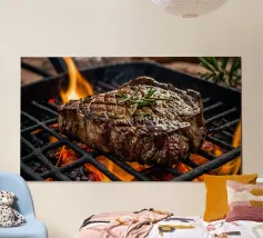 Una bella bistecca alla griglia è adagiata su un piatto bianco, ornato dai segni della griglia. La calda luce del sole mette in risalto i suoi colori ricchi, creando un'atmosfera invitante perfetta per il pranzo.