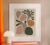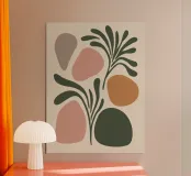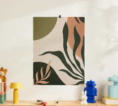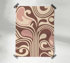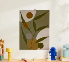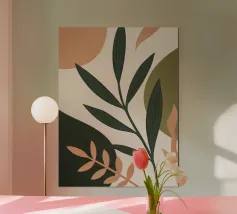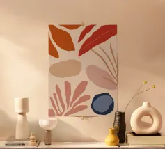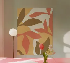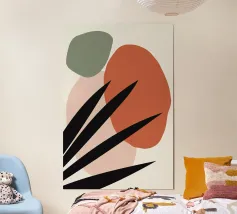 Una miscela armoniosa di natura e astrazione moderna, questo disegno presenta una foglia delicata completata da forme morbide e organiche in una tavolozza di colori pastello. Perfetto per aggiungere un tocco di tranquillità ed eleganza a qualsiasi spazio, questo pezzo di ispirazione boho incarna semplicità ed equilibrio.